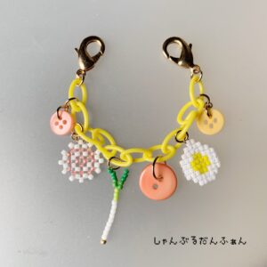 黄色いチェーンをラーメンの麺に見立てて、具材のビーズモチーフを組み合わせたシリーズです。