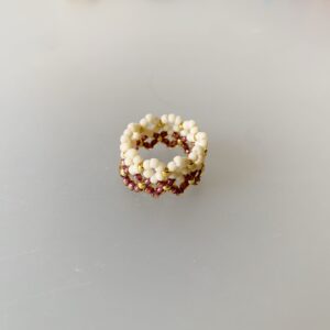 竹ビーズを2段に編み込んだ、斜めのラインがスタイリッシュなリング。幾何学チックなデザインがお気に入りです。単騎づけでも、重ねづけでも可愛いです。