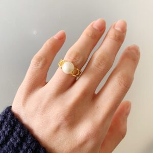 本では5粒でしたが、ダイソーの6mmビーズを使用したので、パール3粒のリングにアレンジしました。パールを使うと、華やかだけど落ち着いた印象もあり、日常使い向きなアクセサリーに仕上がります。