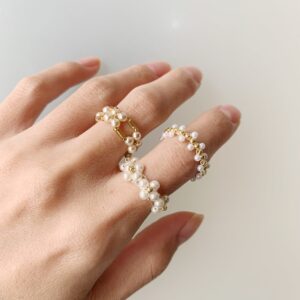 パールビーズ、ラインストーン、ゴールドカラーの丸小ビーズで作ることができます。ラインストーンを使うとジュエリー感が出てかわいいです。
