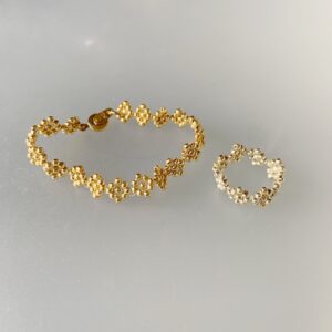 花びら4枚のお花モチーフが並んだリングです。色は少しアレンジしました。黒い花と白い花が交互になっているのが可愛い。