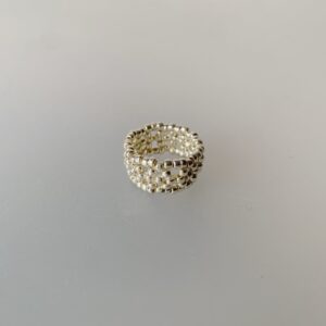 ダイヤのモチーフの上下にビーズを通していくだけで、透かしデザイン風のリングにアレンジすることができます。本に載っているレシピではなく、自分で思いつきました(笑)ダイヤモチーフの間に3個ずつビーズを通していくといい感じになります。